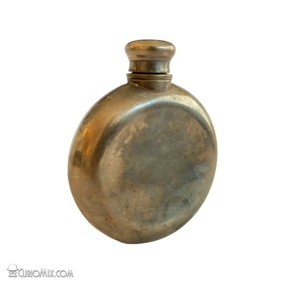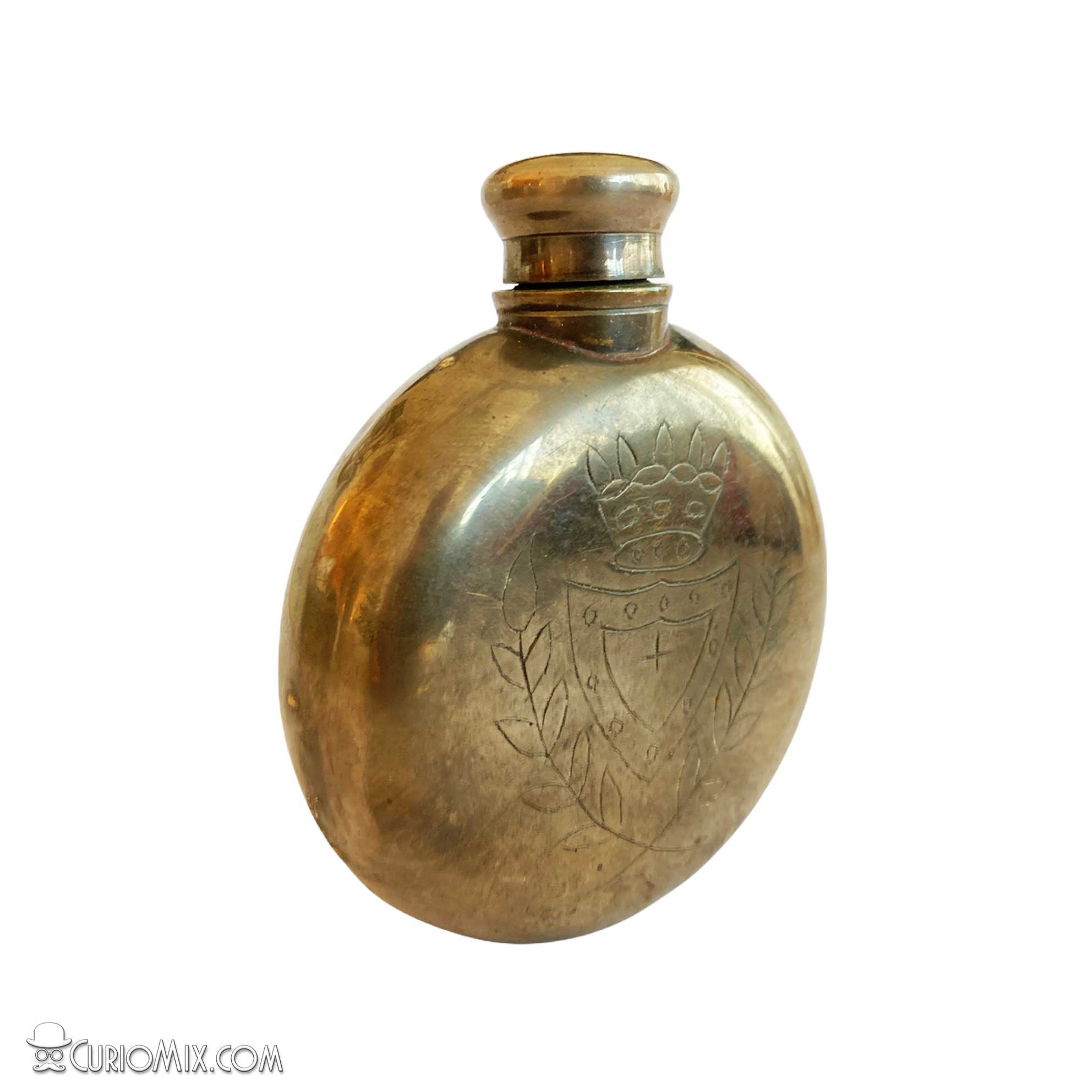Metal hip flask with screw-top and simply engraved shield wreath and crown.