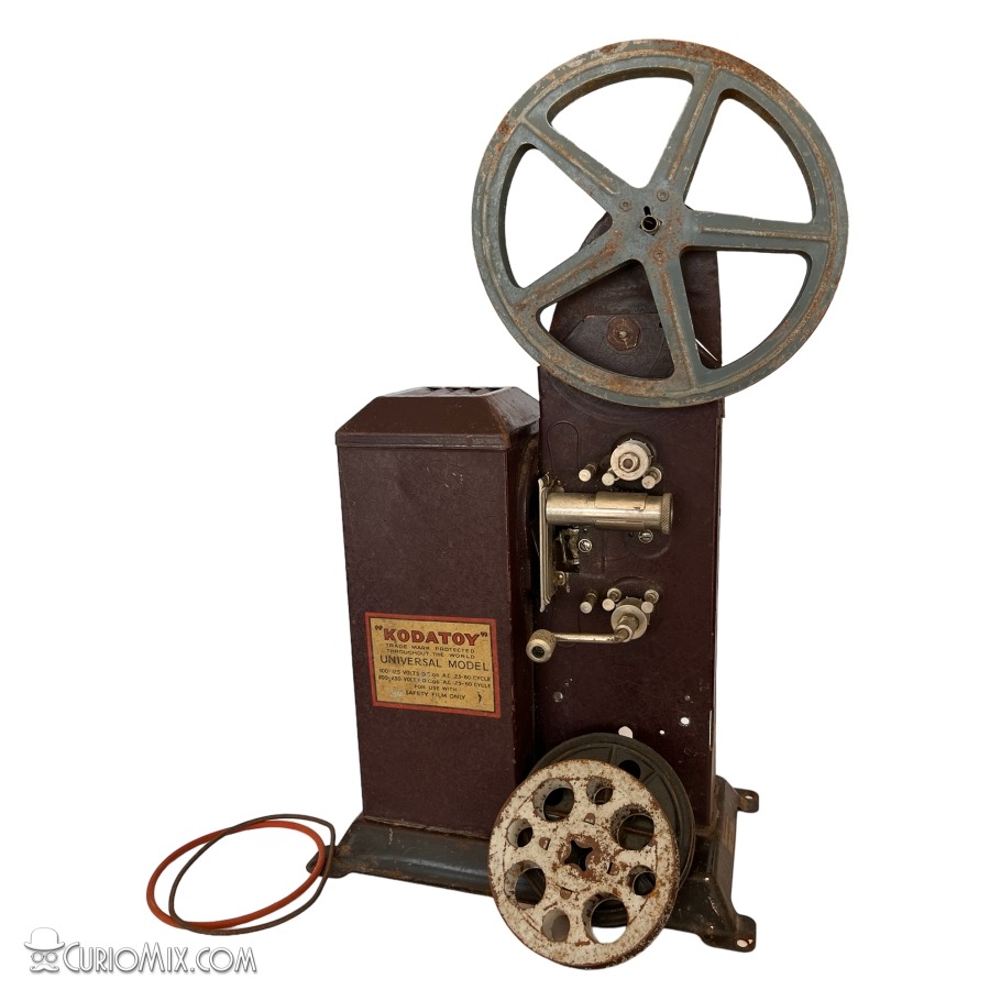 Kodatoy Universal Model. A hand cranked 16mm projector made by Kodak Ltd. London in 1932. Originally intended for use by children. In good condition, but with some small parts missing. Empty spools and bands (metal & rubber) included.