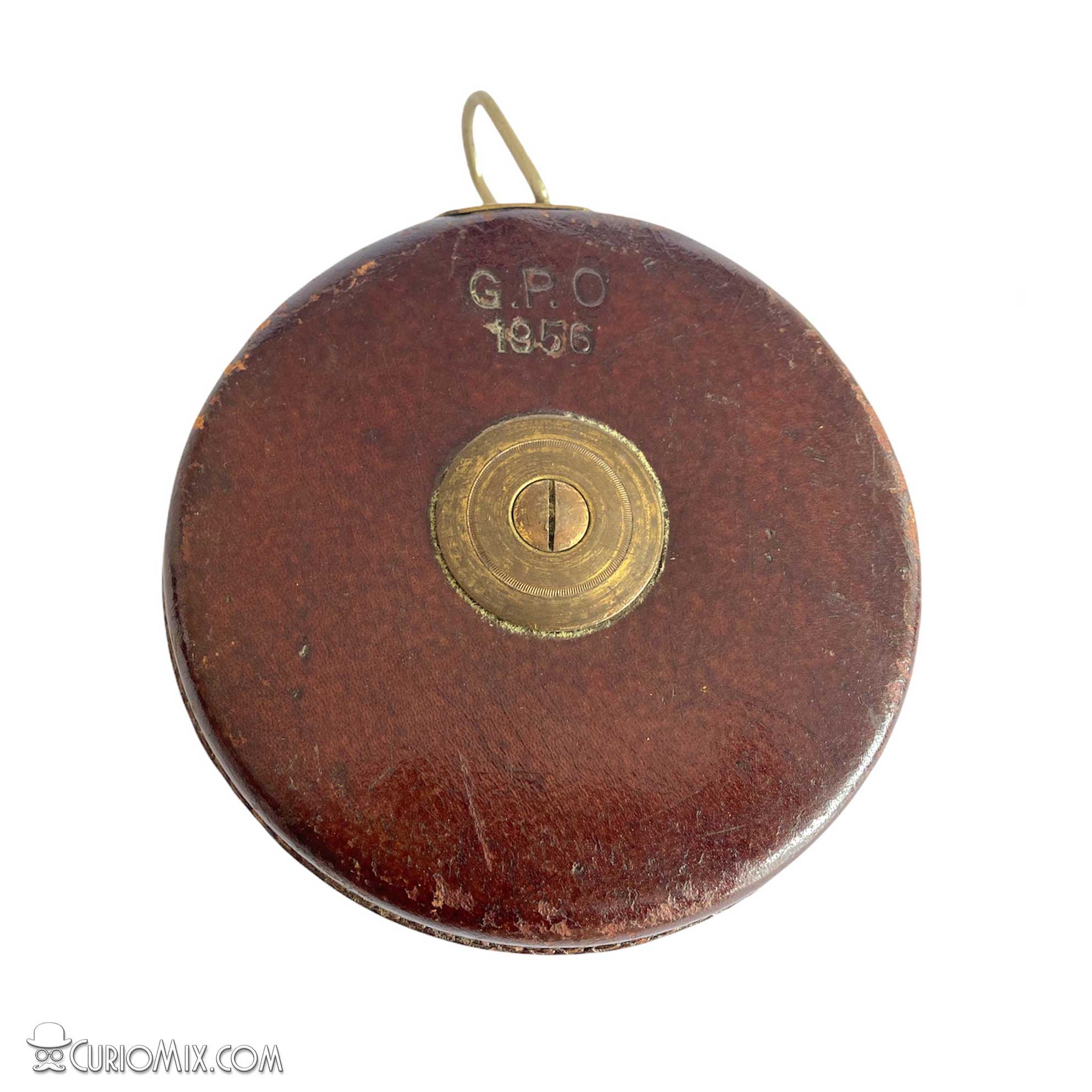 Leather and Brass 66ft tape measure with manufacturers: John Rabone & Sons – Birmingham England, and stamped G.P.O. 1956.